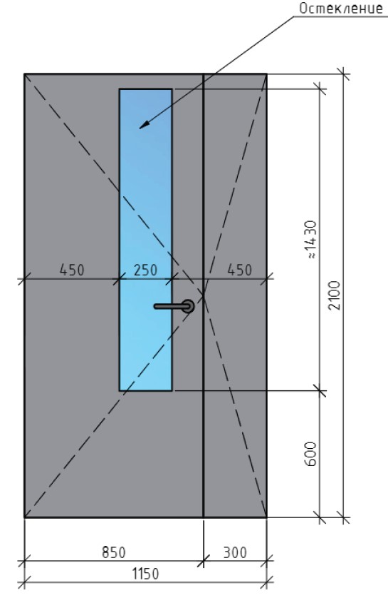 - Отделка Металл с двух сторон окрашен полимерным порошком RAL 7024 (антроцитово-серый). Армированный, противопожарный EI-30 стеклопакет на полотне 500*900мм