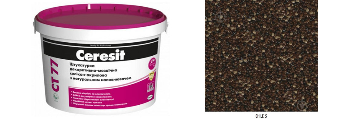 - Наименование: CERESIN СТ 77. Штукатурка декоративно-мозаичная силикон-акриловая с натуральным наполнителем цветовая композиция CHILE 5