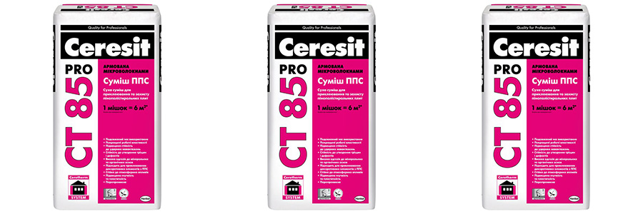- Наименование: Клеевая смесь Ceresit CT 85 Pro для ППС армированная микроволокнами